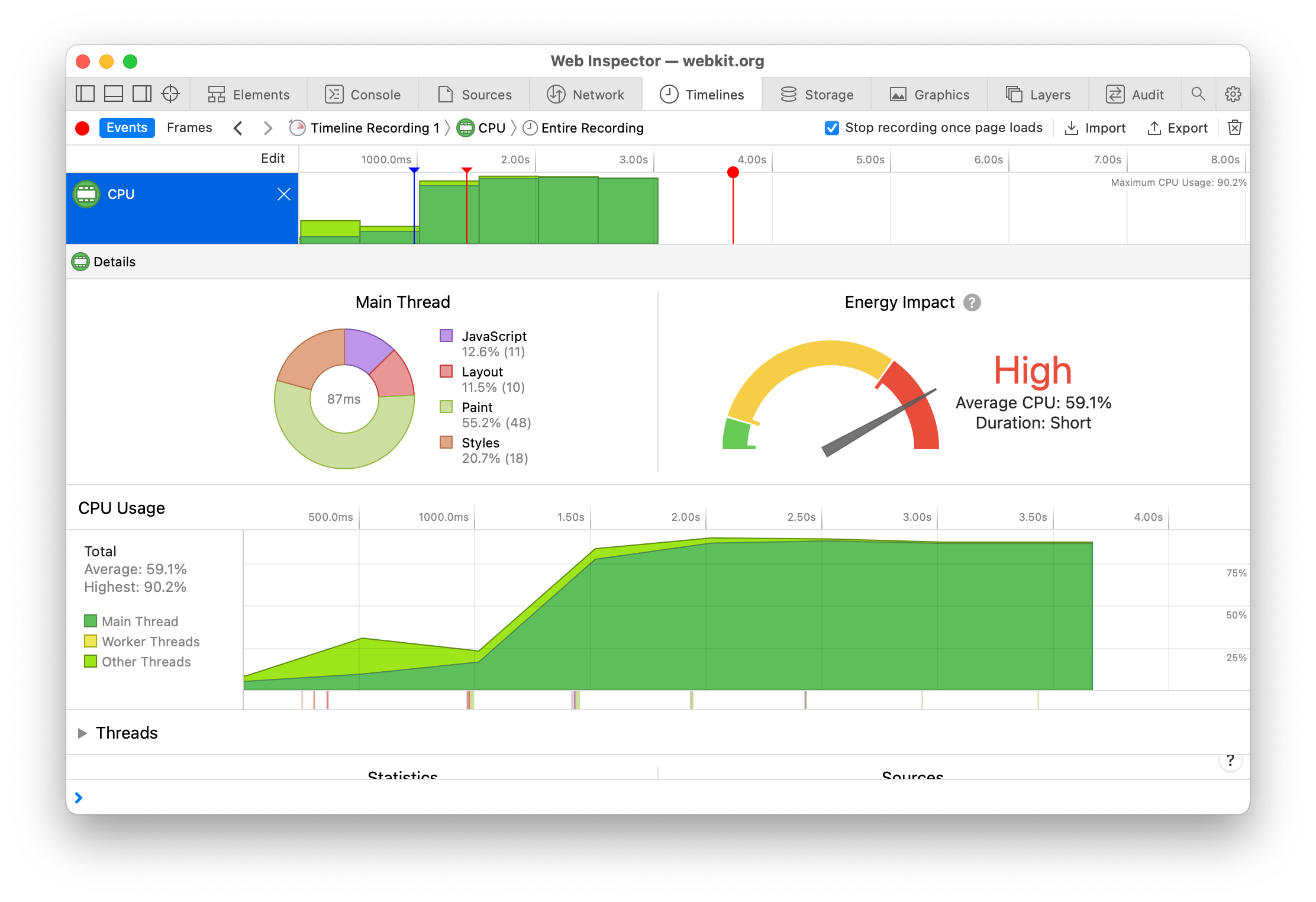 The CPU timeline graphs the CPU usage of all threads related to the inspected page during the timeline recording, as well as lists additional statistics about the number and type of event listeners, timers, network activity, script entries, etc. that were executed during the timeline recording.