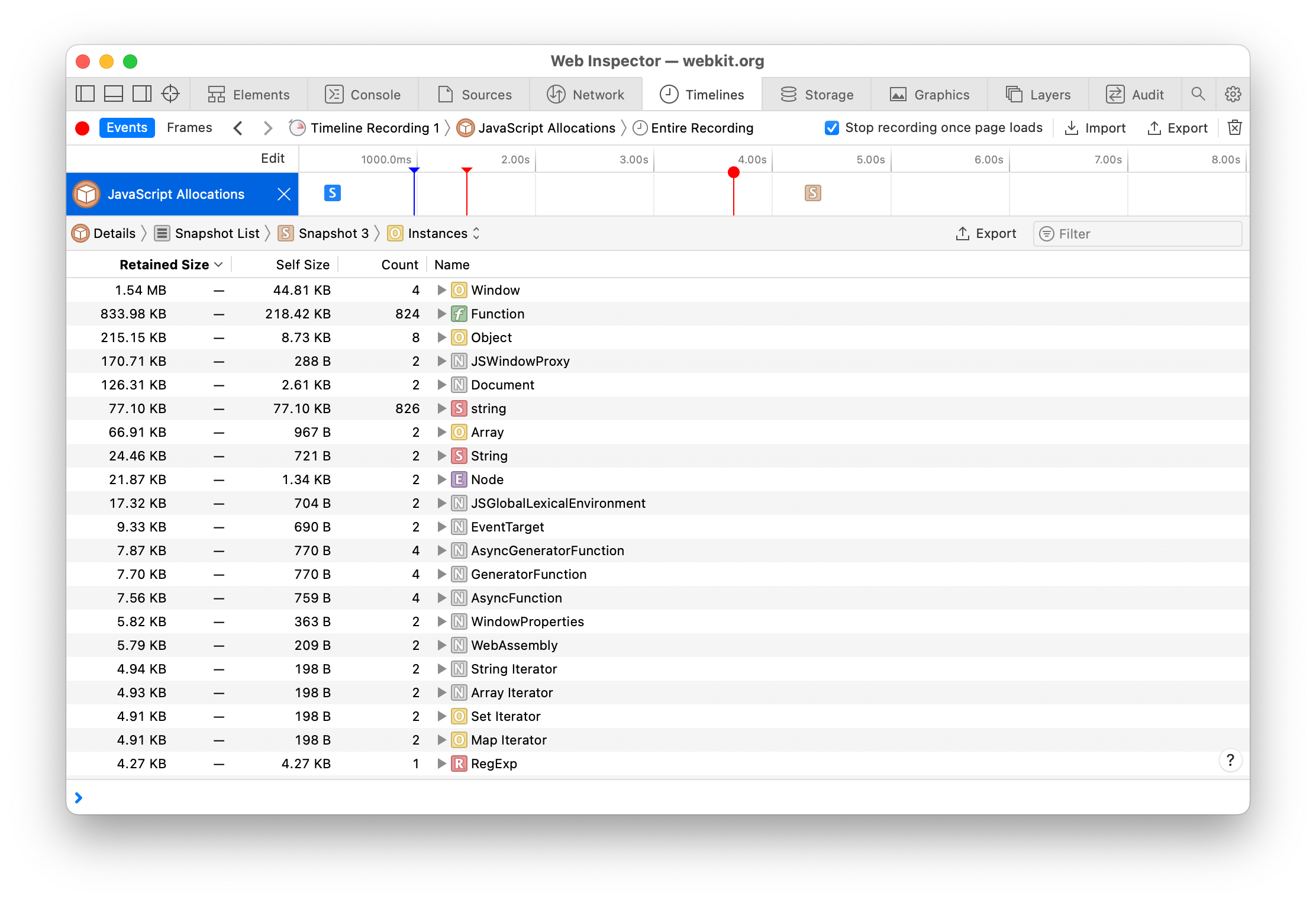 The JavaScript Allocations timeline lists all JavaScript heap snapshots that have been captured since Web Inspector was opened and also contains tools for comparing the existence and of objects in heap snapshots and visualizing the shortest path from any given object to the root global object.